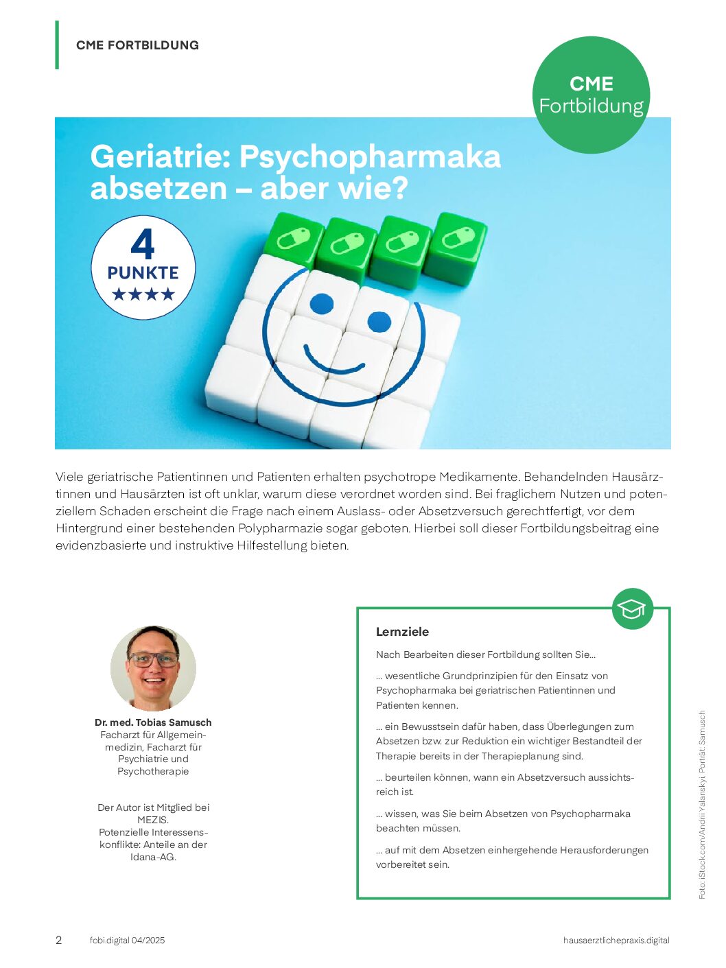 Die Integration von Absetzempfehlungen in Leitlinien und die Bereitstellung praxisnaher Hilfsmittel auch seitens der Fachgesellschaften (zum Beispiel Spickzettel, Checklisten) sind nötig, um eine rationale, evidenzbasierte Reduktion von Psychopharmaka in der Versorgung geriatrischer Patientinnen und Patienten zu fördern.