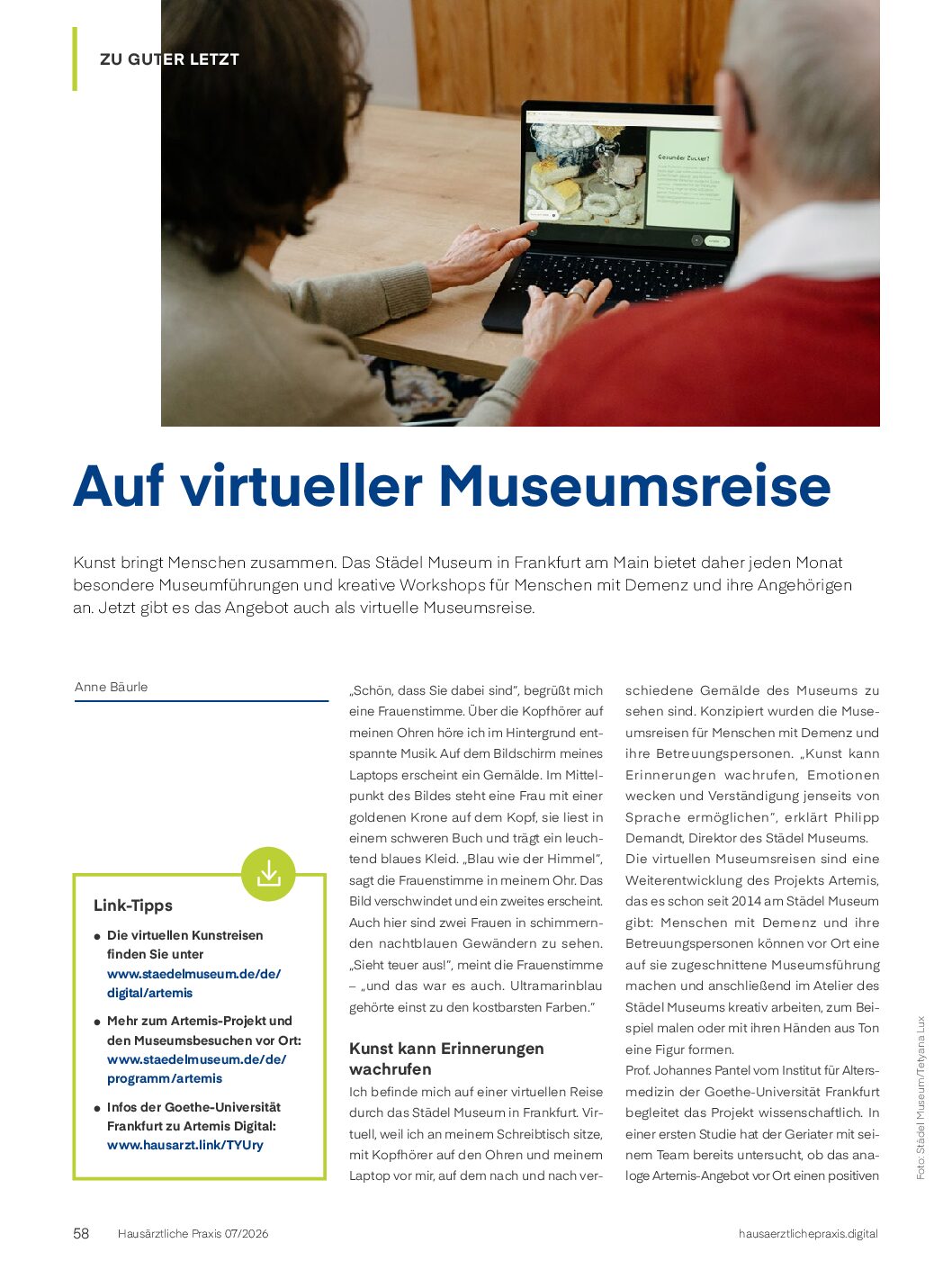 Ob der virtuelle Museumsbuch mit anschließendem Malen auch so positiv wirkt? Auch das haben Johannes Pantel und sein Team in einer zweiten Studie untersucht, die Ergebnisse fließen in eine Masterarbeit und sind derzeit noch nicht veröffentlicht. “Was ich aber schon sagen kann: Die Ergebnisse sind vielversprechend”, berichtet der Geriater.