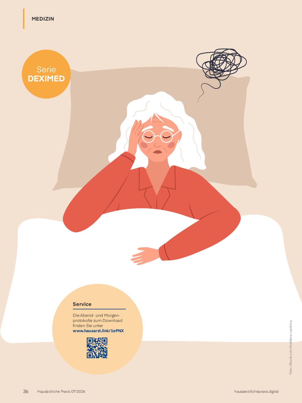 Zur Diagnostik bei Insomnie empfiehlt die Leitlinie, neben einer ausführlichen Anamnese zum Schlafverhalten, psychosozialen Belastungen, Medikamenteneinnahme und Substanzkonsum, den Einsatz eines Schlaftagebuchs, z. B. des Abend-Morgenprotokolls der DEGAM (s. Kasten unten). In der Regel sind keine weiteren Untersuchungen in der Hausarztpraxis erforderlich.
