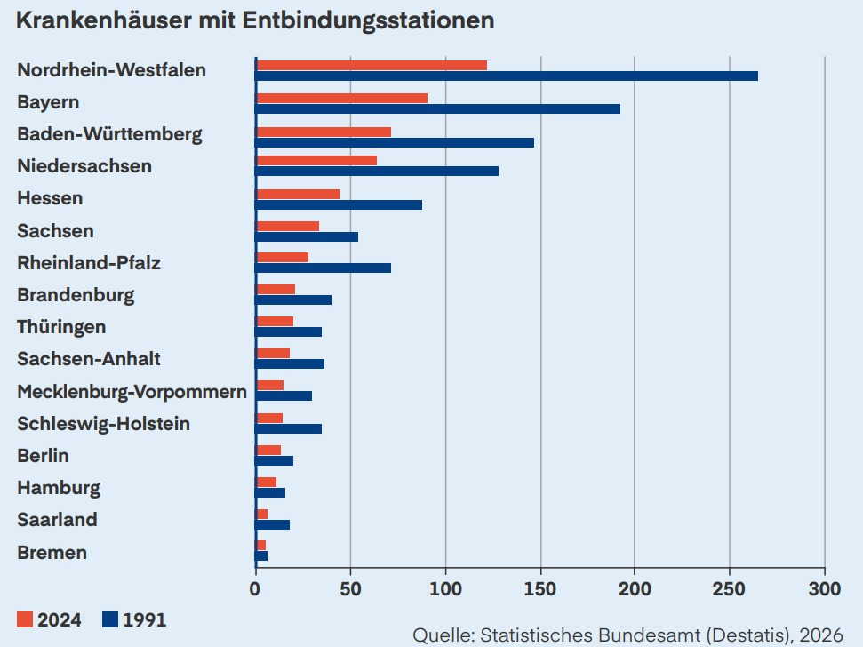 Der Rückgang der Anzahl der Entbindungskliniken und der Fachabteilungen für Frauenheilkunde und Geburtshilfe falle in den einzelnen Bundesländern unterschiedlich stark aus.