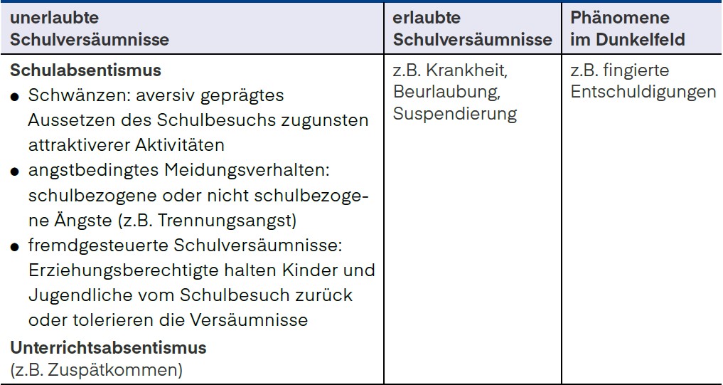 Schulabsentismus bzw. schulvermeidendes Verhalten ist ein Oberbegriff für alle Formen des Fehlens in der Schule, das nicht aufgrund somatischer Befunde erfolgt (s. Abb. 1 unten).