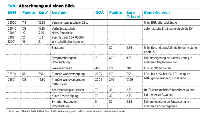 Anamnese und klinische Untersuchung sind durch die Versichertenpauschale (03000 EBM) abgedeckt; dazu kommen die automatischen durch die KV ergänzten Pauschalen (03040, 03060, 03061 und 32001 EBM). Die Abrechnung der Wundversorgung erfolgt bei den Schürfwunden mit der 02300, bei der Platzwunde mit der 02301 EBM. Die Infiltrationsanästhesie kann nicht gesondert berechnet werden – ebenso wie anfallende Verbände.
