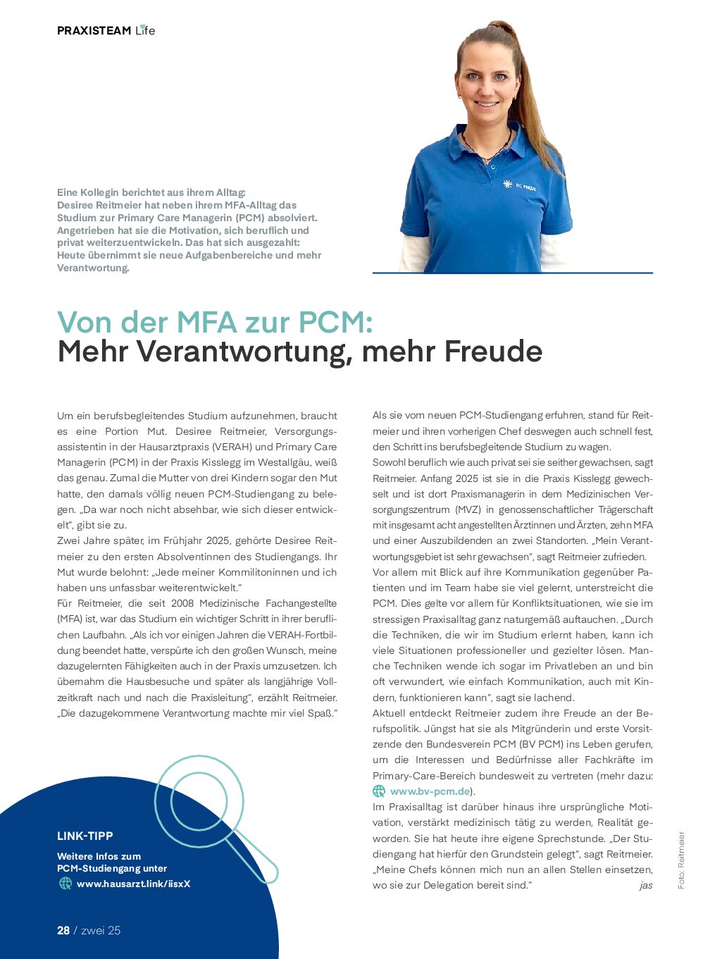 Aktuell entdeckt Reitmeier zudem ihre Freude an der Berufspolitik. Jüngst hat sie als Mitgründerin und erste Vorsitzende den Bundesverein PCM (BV PCM) ins Leben gerufen, um die Interessen und Bedürfnisse aller Fachkräfte im Primary-Care-Bereich bundesweit zu vertreten (mehr dazu: www.bv-pcm.de).